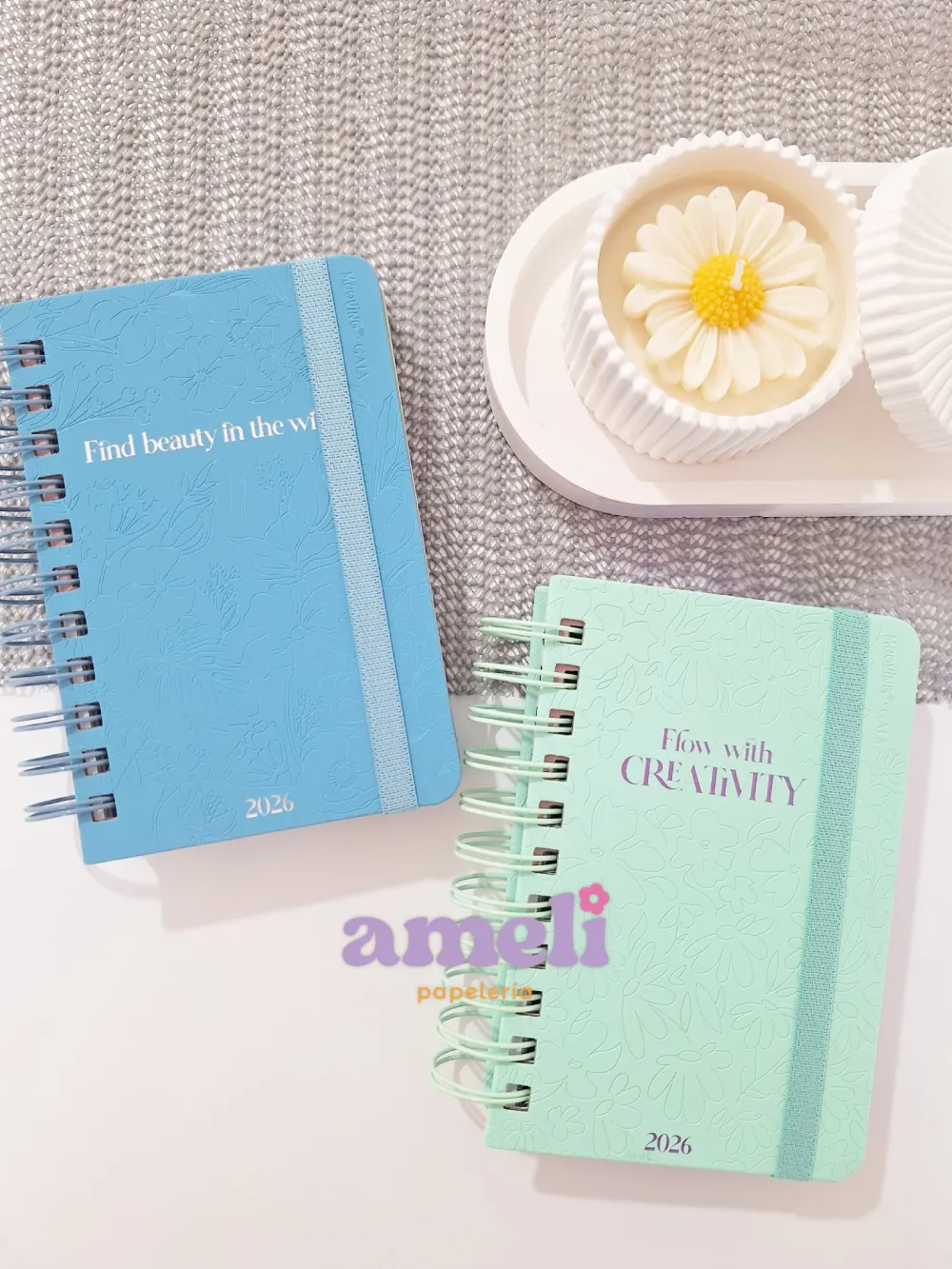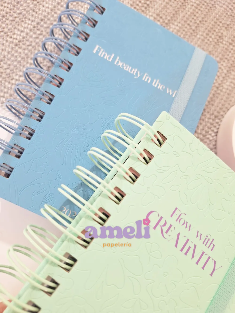 Agenda Mooving Gala 2026, con una estética elegante y sofisticada. Se presenta en dos diseños: uno en verde con la frase “Flow with creativity” y otro en celeste con la frase “Find beauty in the wild”.