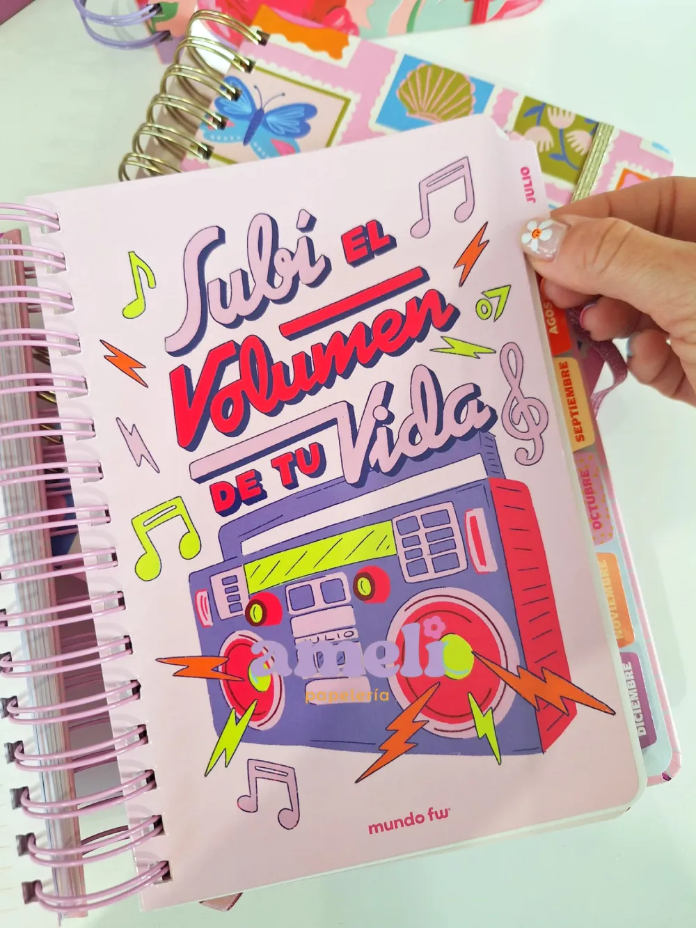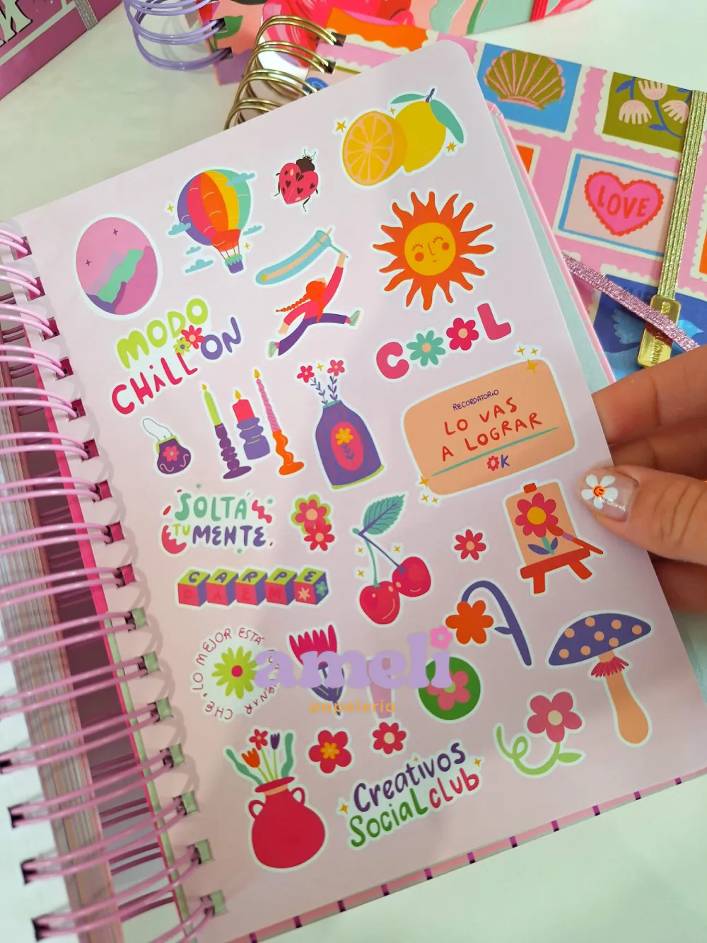Agenda premium Trend con vista diaria. 200 hojas. Papel de 80g. Incluye sobre interno, 3 hojas con stickers personalizados, charm y elástico, 2 cintas señaladoras y una hoja troquelada con señaladores. Además hojas para gastos, planner mensual y anual. 12 separadores: carátulas mensuales con diseños laminados con solapa y 12 ejercicios: actividades al comienzo de todos los meses.