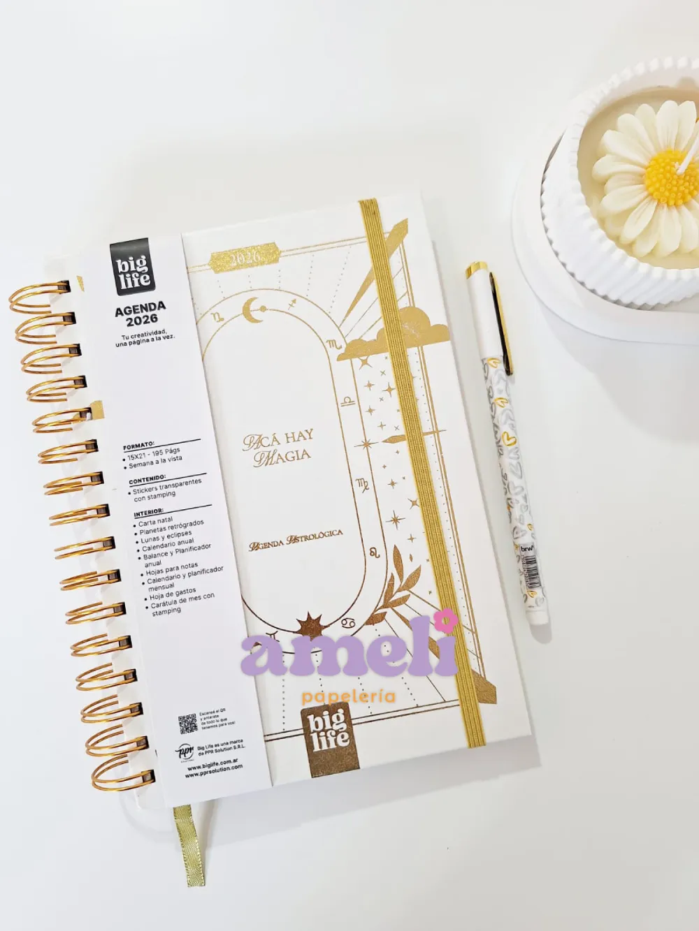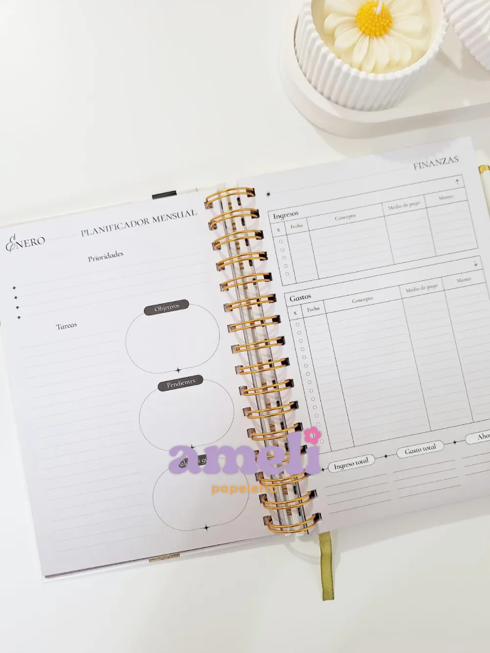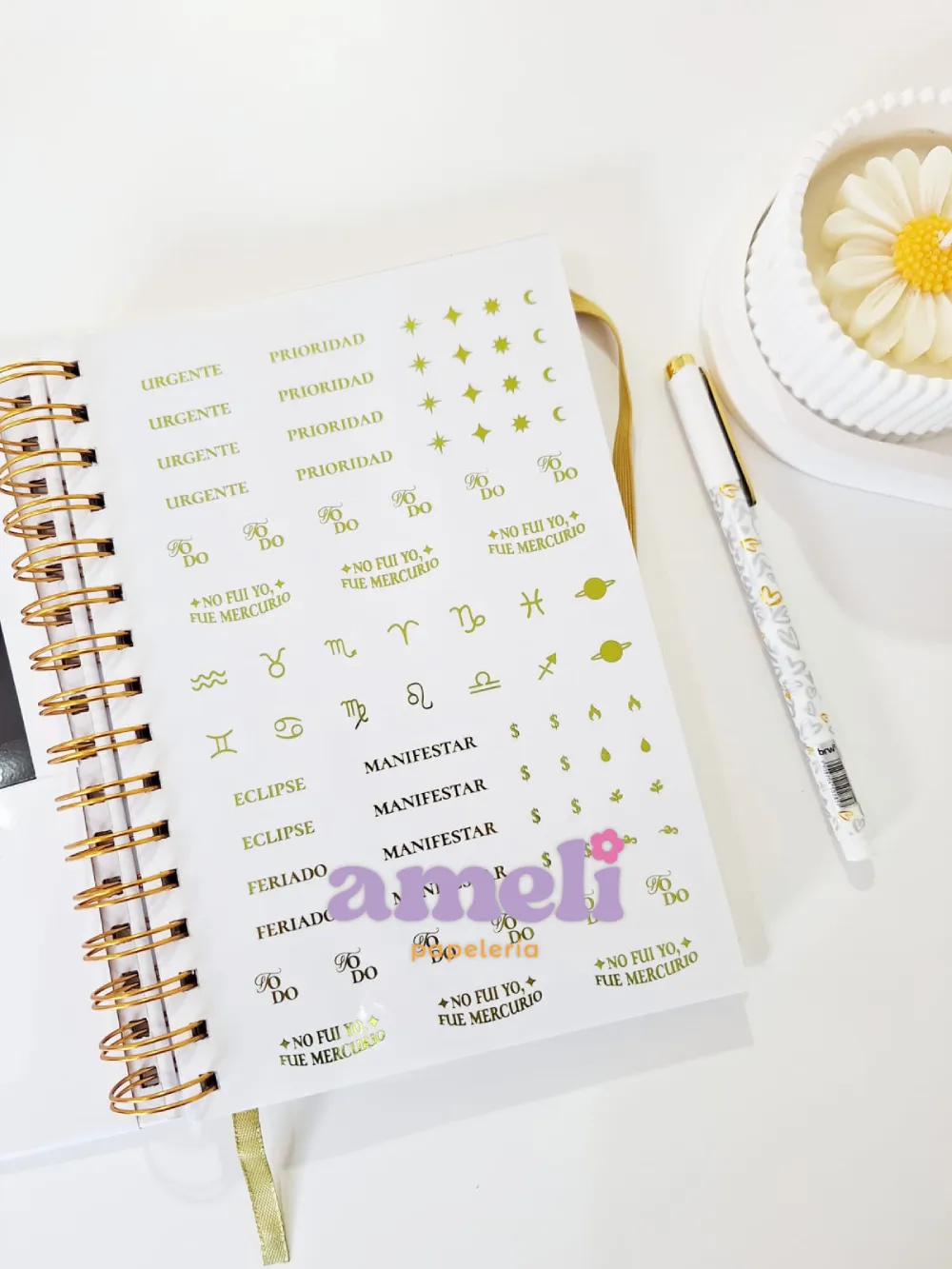 Carta natal, Planetas retrógrados, Lunas y eclipses, Calendario anual, Balance y Planificador anual, Hojas para notas, Calendario y planificador mensual, Hoja de gastos, Caratula del mes con stamping.