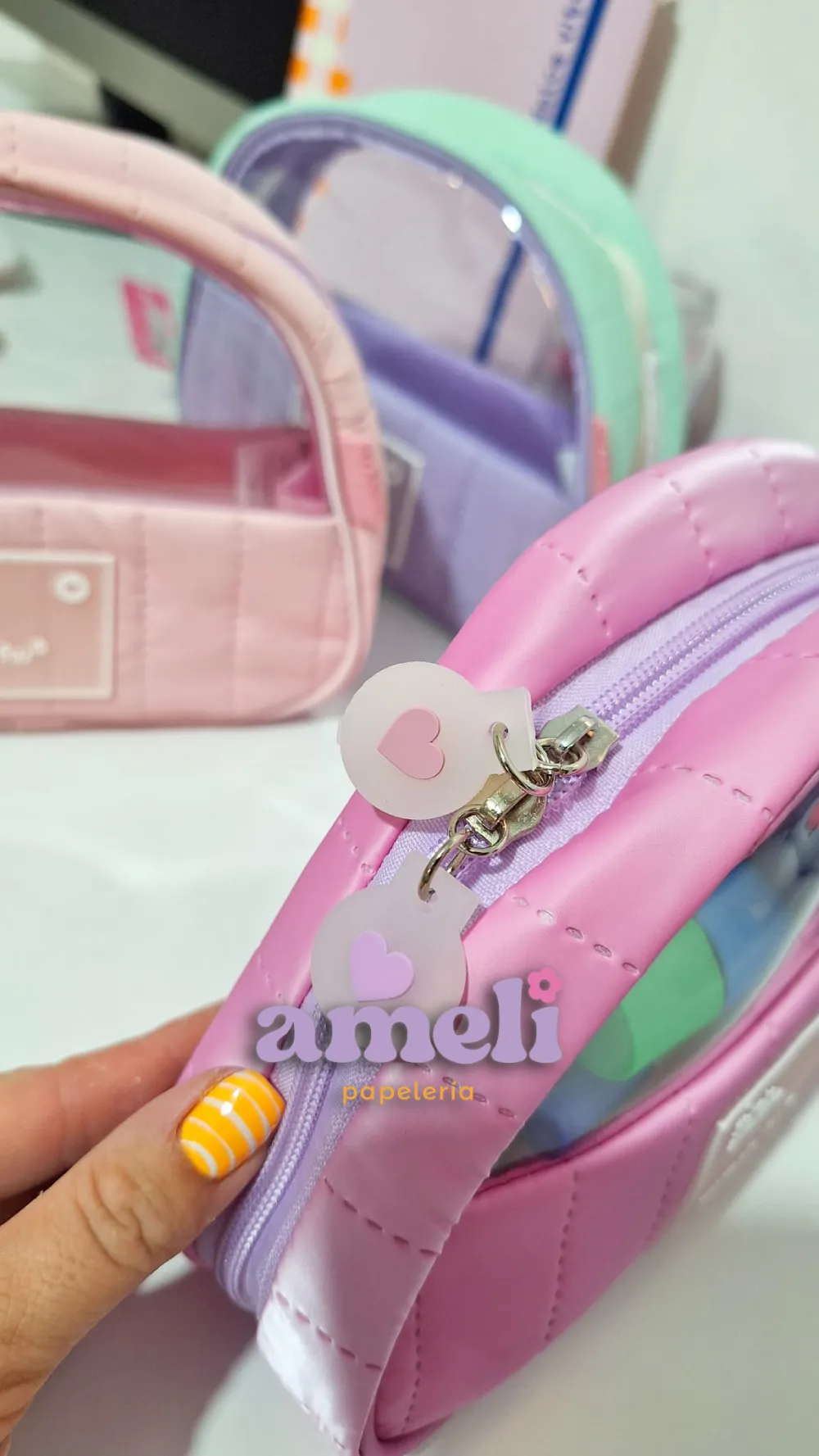1 compartimento principal de pvc transparente con cierre. Textil matelasse brillante.