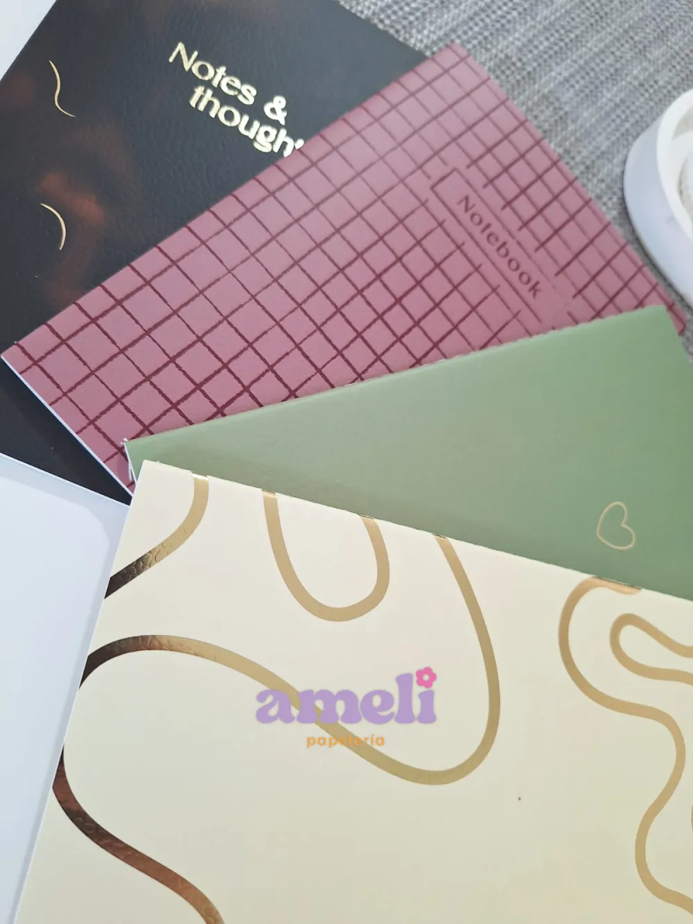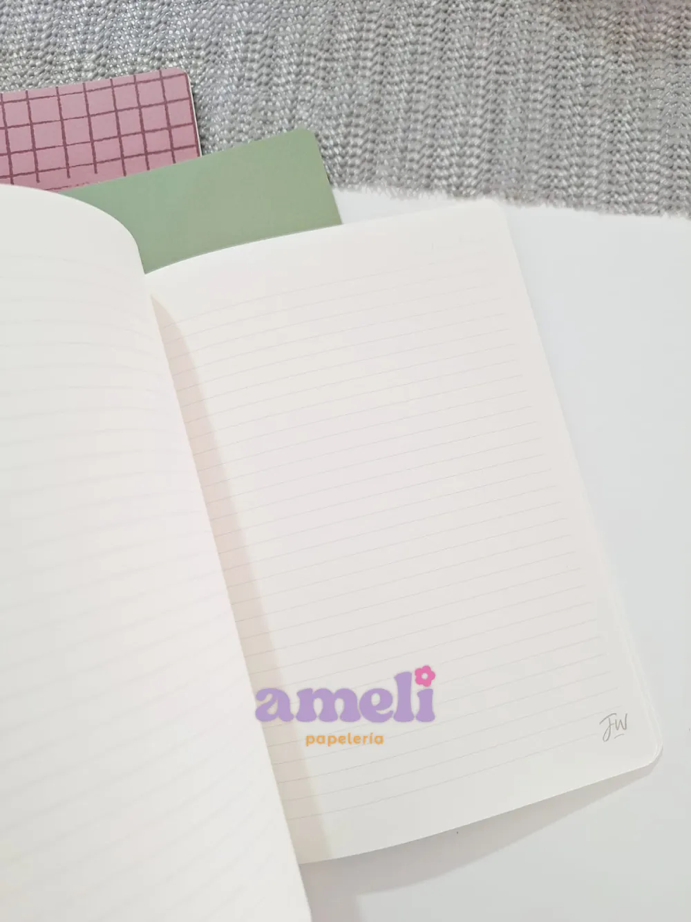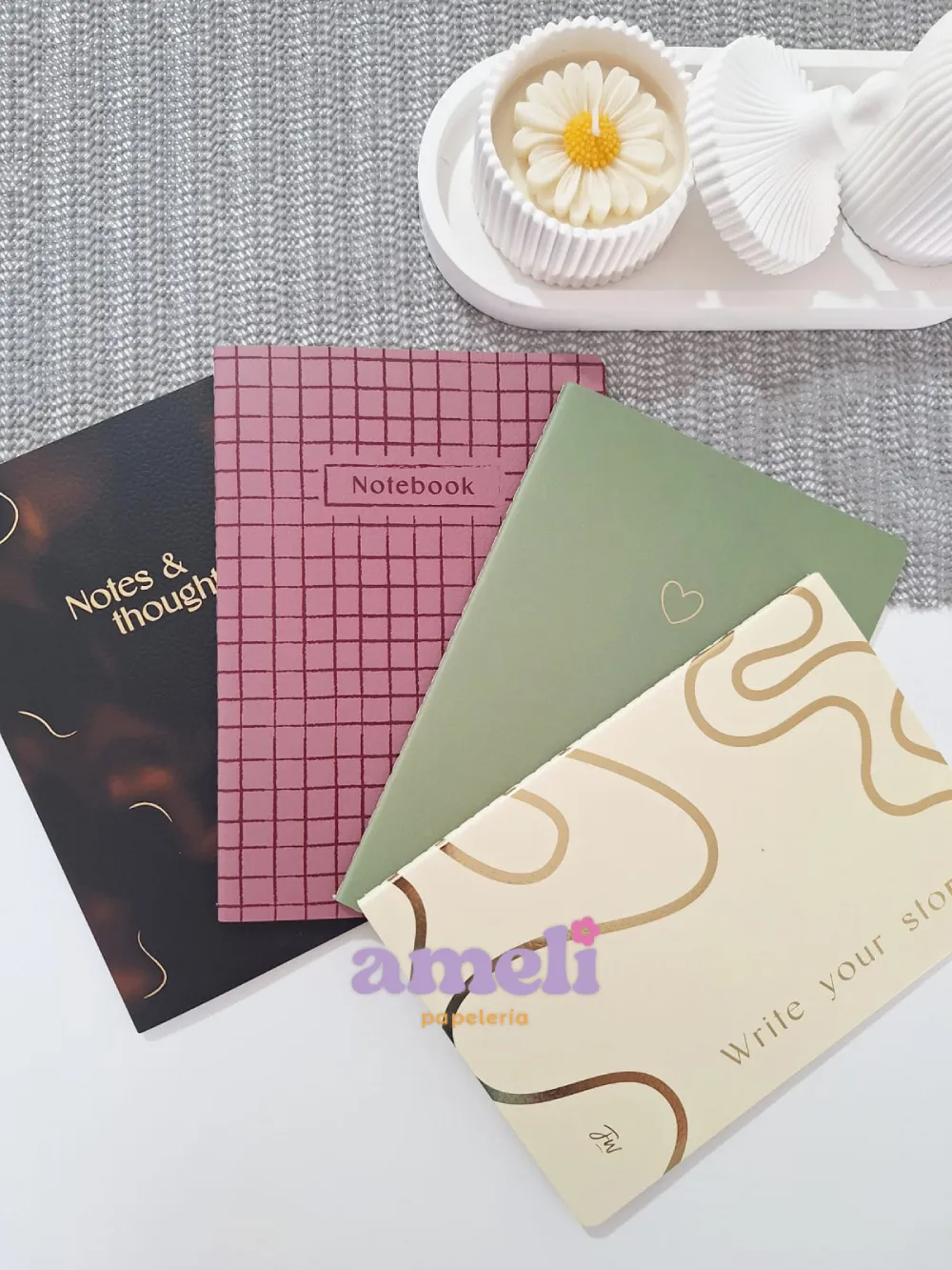 Set de 4 cuadernos con hojas rayadas, cuadriculadas, lisas y bullet. Tapa 250g de papel texturado laminado. Detalles en stamping. 32 hojas de 80g. Tamaño 148 x 210 mm. Lomo cocido